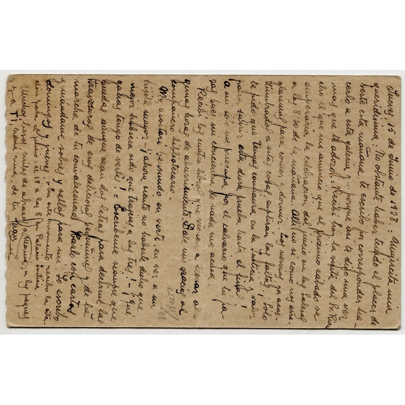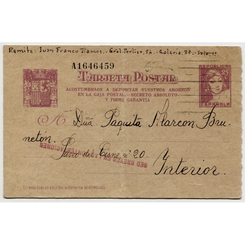 Stationery post card Edifil 79A from General Porlier prison to Madrid. The sender is Juan Franco Ramos, 3rd Gallery, 1st Room. Mark "SED BREVES EN LAS CONTESTACIONES". Unreadable postmark but text on the back dated on June 15, 1938.