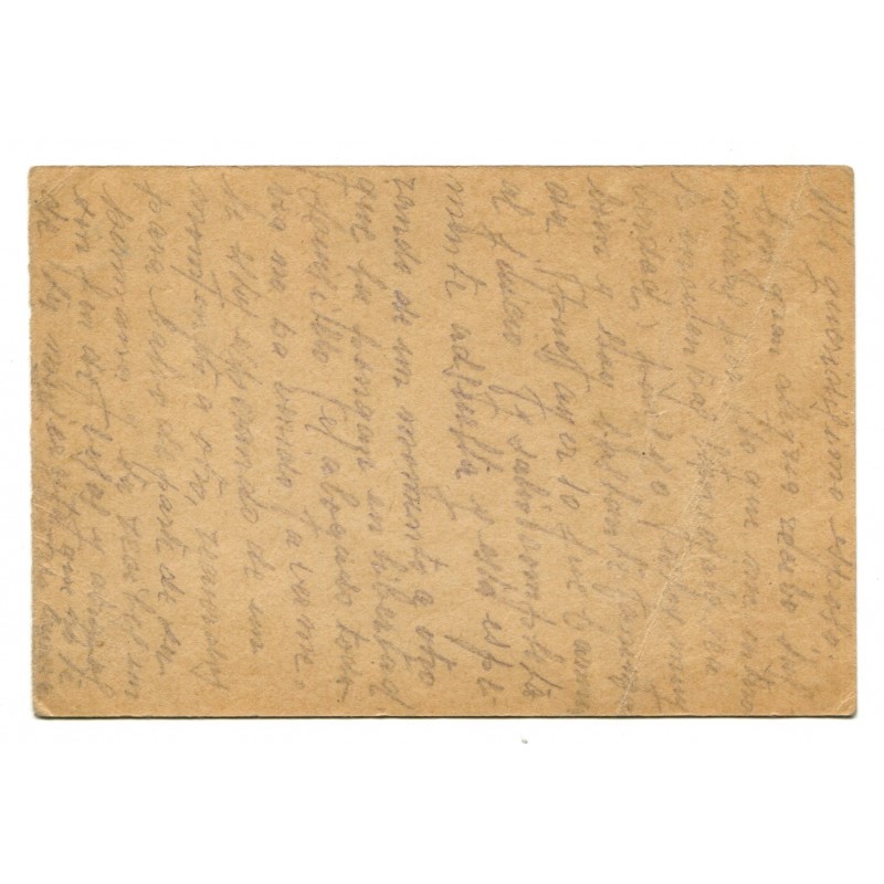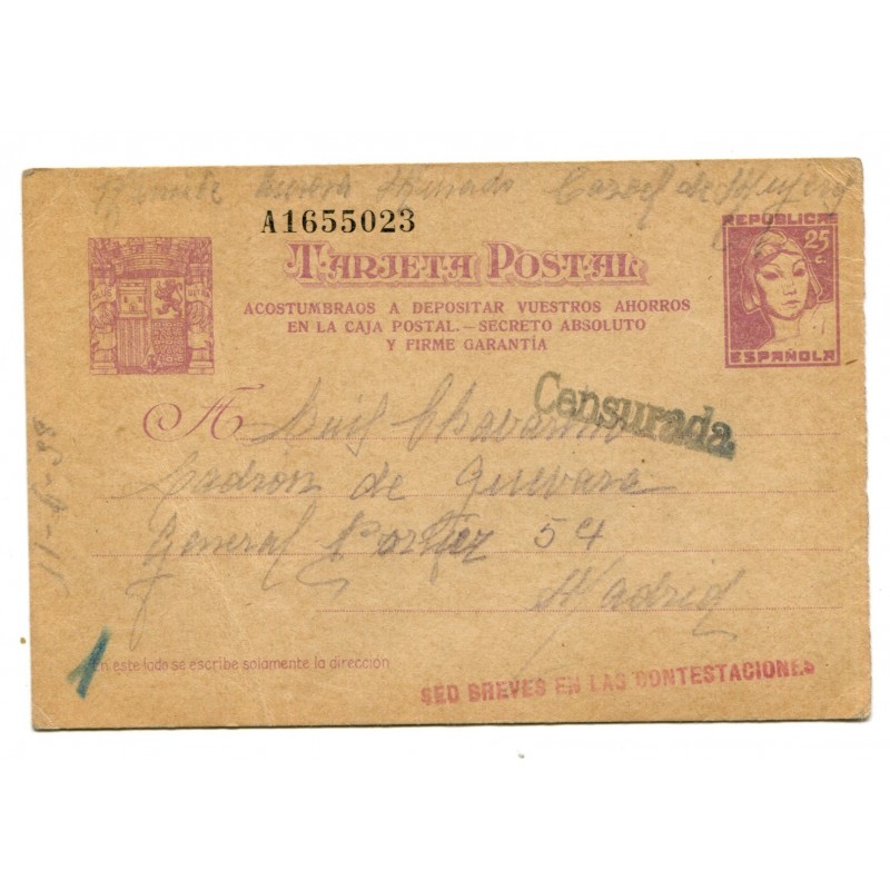Sent to Luis Cavarino by his wife Aurora Murado, also held in Las Ventas prison, also in Madrid. The prison in Madrid’s General Porlier street was officialy named «Prisión Provisional de Hombres Nº 3». The stationery post card bears two marks: «Censurada» in black ink and «Sed breves en las contestaciones» in red, both stamped upon arrival to General Porlier’s prison. No postmark, but text dated on June 11, 1938.