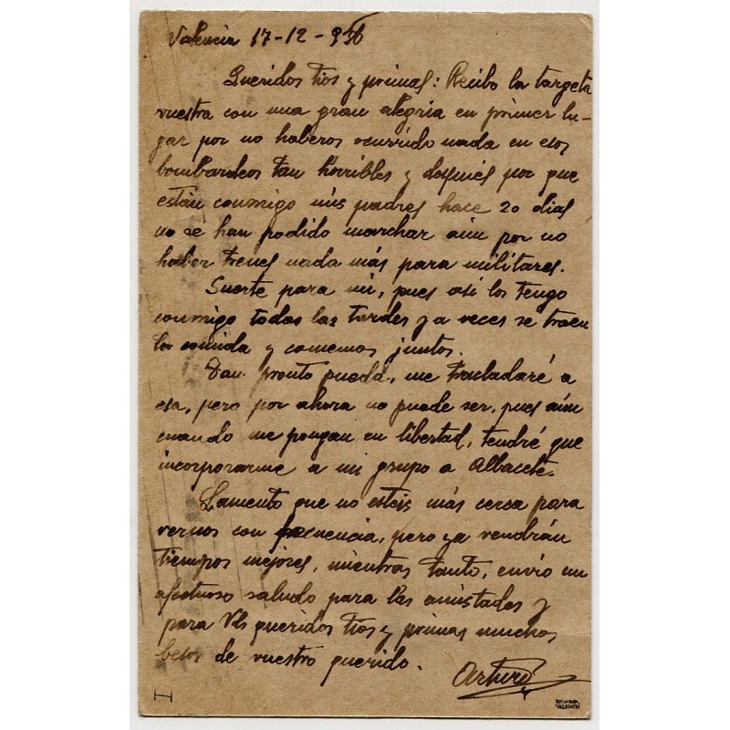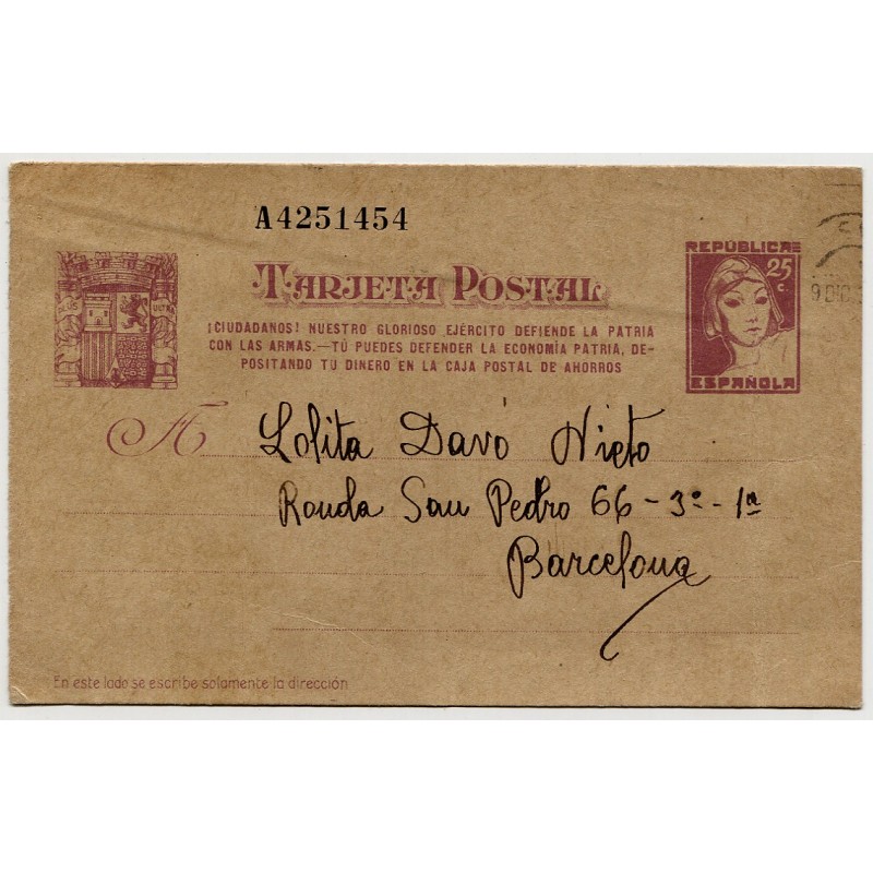 Stationery post card Edifil 80A from Valencia to Barcelona, 1938
