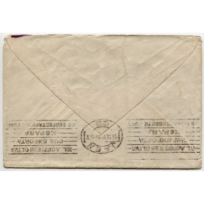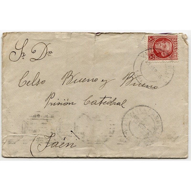 Sobre franqueado con 30c Edifil 687 y fechador de Villacarrillo de 13 de agosto de 1936 enviado a Celso Bueno y Bueno, en la Prisión Catedral de Jaén. Al dorso, matasellos de rodillo de llegada de Jaén del mismo día. La Catedral de Jaén fue convertida en cárcel del 3 de agosto de 1936 al 7 de noviembre de 1937. Rarísimo.