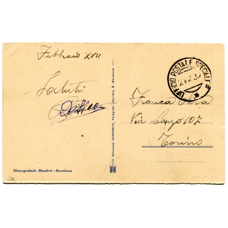 Corpo Truppe Volontarie, tarjeta postal a Torino con matasellos Ufficio Postale Speciale 3, 1939