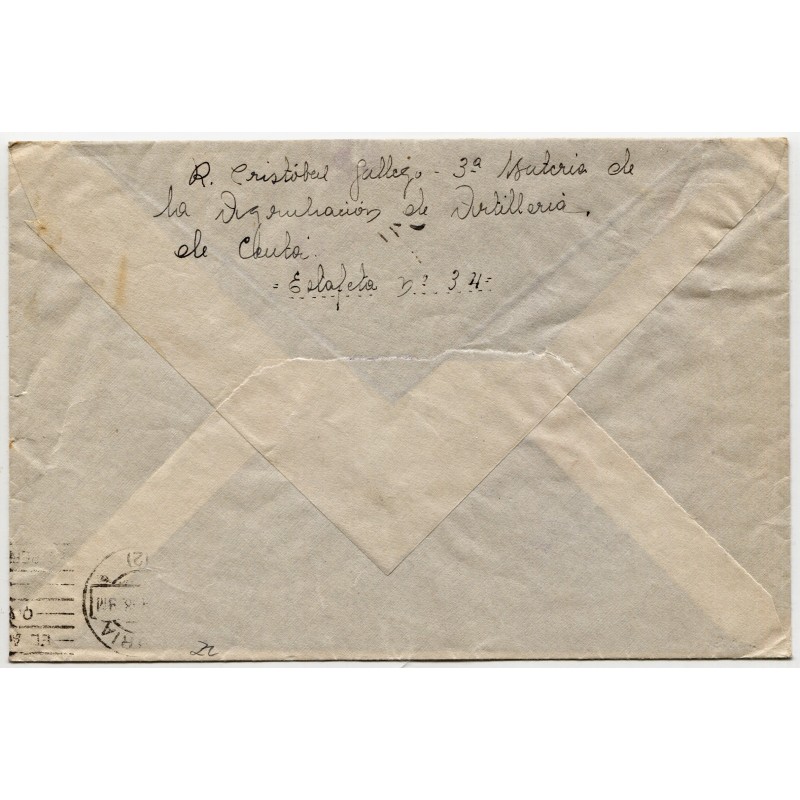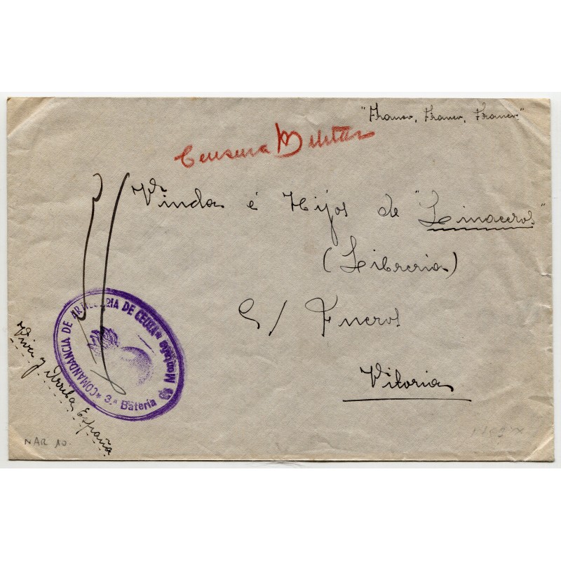 Marca de franquicia "COMANDANCIA DE ARTILLERÍA DE CEUTA / 3ª Batería de Montaña" y llegada de Vitoria al dorso. Censura militar manuscrita a lápiz rojo.