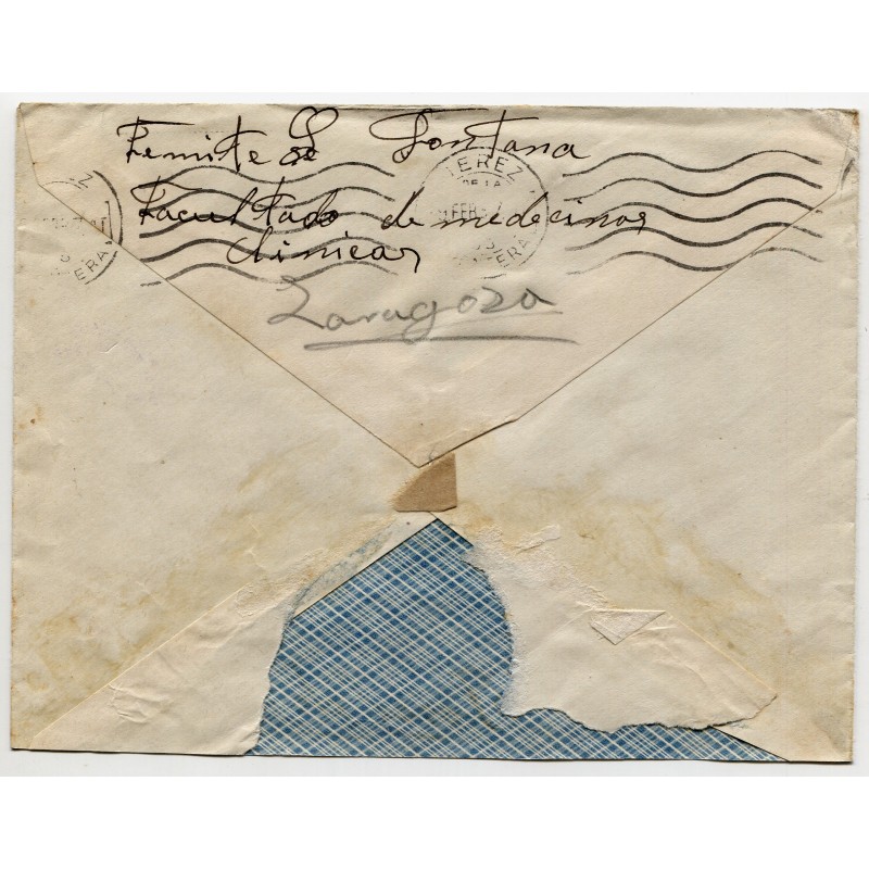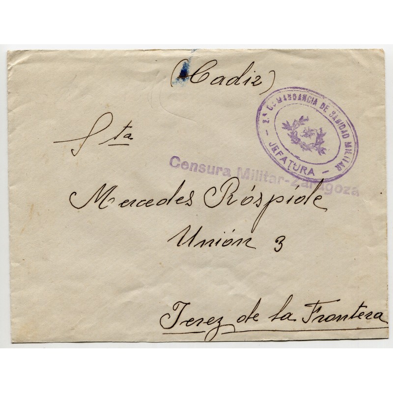 Franquicia "2ª COMANDANCIA DE SANIDAD MILITAR - JEFATURA" y marca de censura de Zaragoza Heller Z8.1. Llegada de Jerez de la Frontera al dorso.