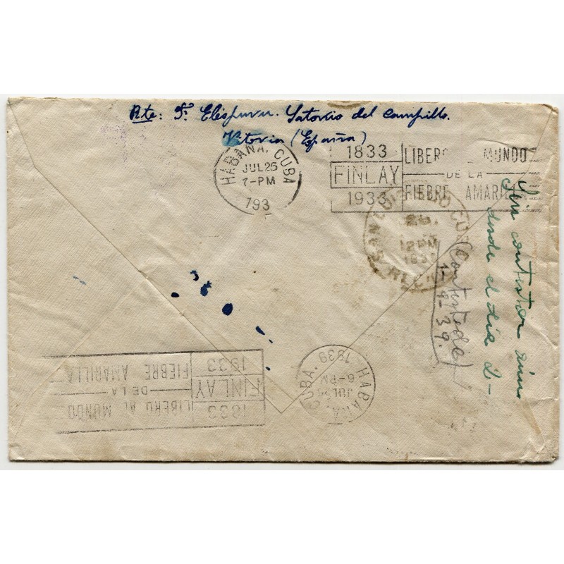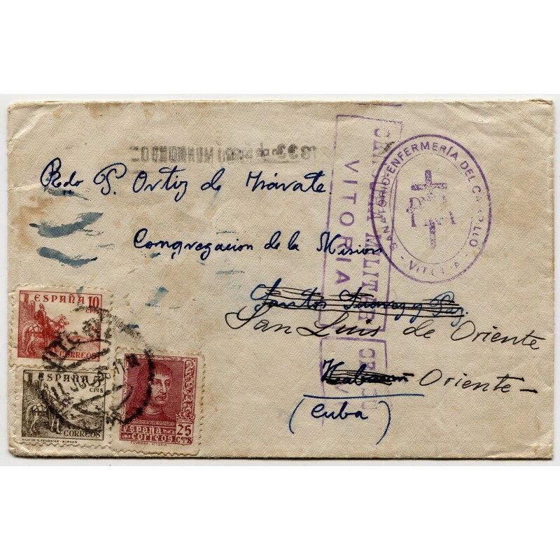 Sobre de Vitoria a la Habana, Cuba, redirigido a San Luis de Oriente. Matasellos de Vitoria de 11 de julio de 1939, censura Heller V107.5 y marca "SANATORIO-ENFERMERIA DEL CAMPILLO - VITORIA". Al dorso, tránsitos y llegada de la Habana y San Luis.