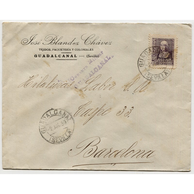 Sobre de Guadalcanal a Barcelona con censura y local, 1939