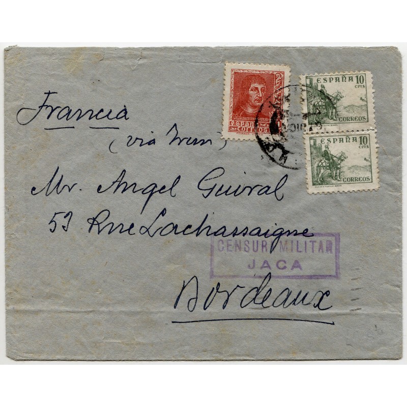 Matasellos de Hecho (Huesca), marca de censura de Jaca Heller J2.8, y llegada de Bordeaux al dorso.
