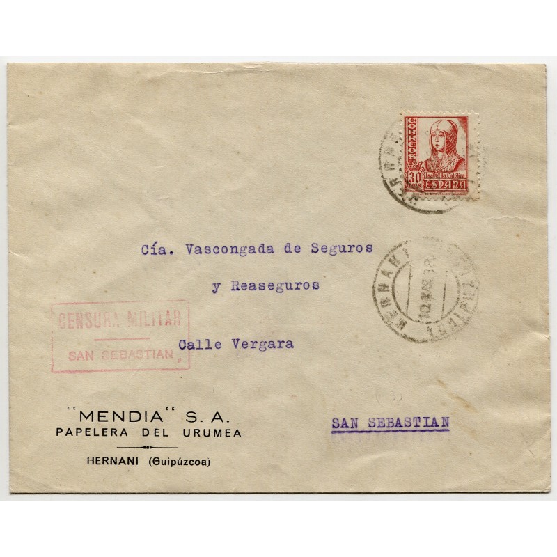 Sobre de Hernani a San Sebastián con censura, 1938