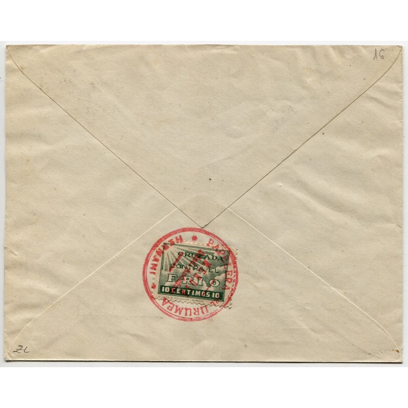 Matasellos de Hernani de 10 de marzo de 1938 y marca de censura de San Sebastián Heller S49.11b. Al dorso, viñeta de Cruzada Contra el Frío.
