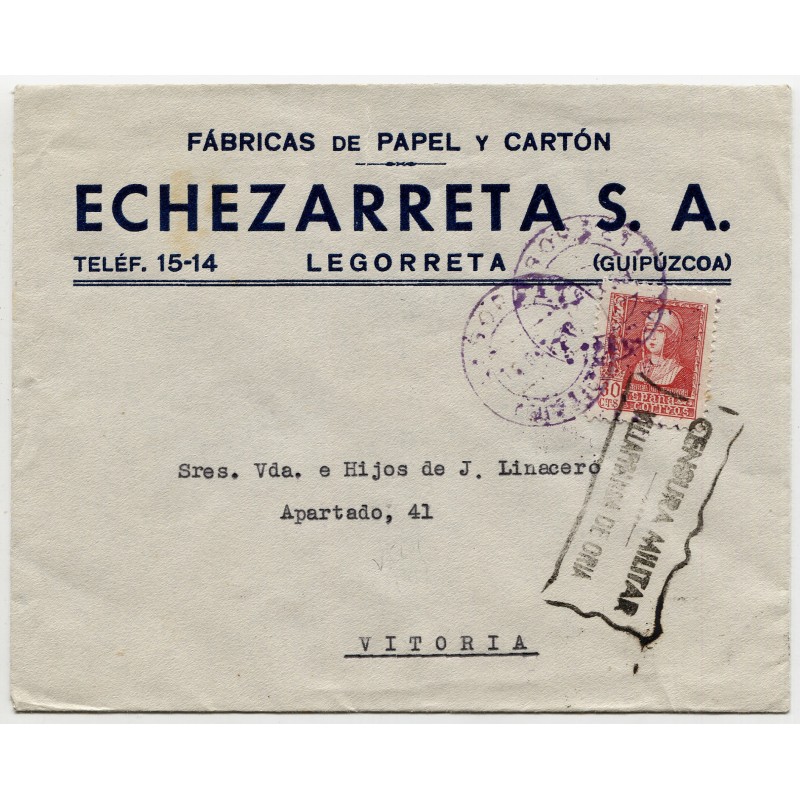 Sobre de Legorreta a Vitoria con censura de Villafranca de Oria, 1938