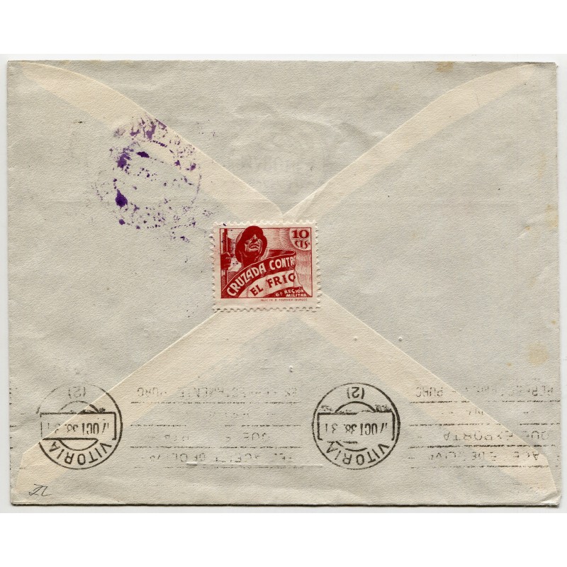 Matasellos de Legorreta con fecha ilegible, censura de Villafranca de Oria Heller V61.1b y llegada de Vitoria de 7 de octubre de 1938. Viñeta de la Cruzada contra el Frío al dorso.