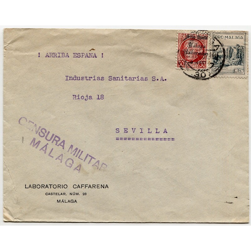 Sobre de Málaga a Sevilla con sobrecarga patriótica, local y censura, 1937