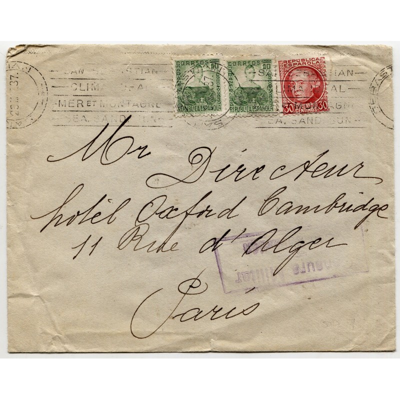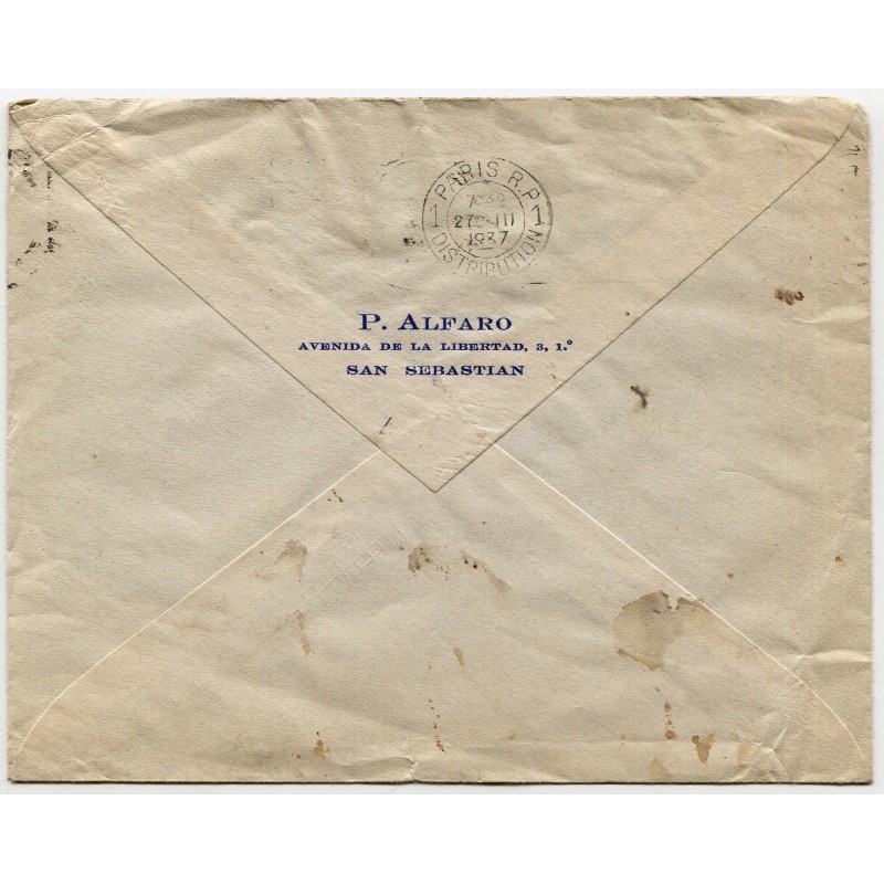Marca de censura de San Sebastián Heller S49.6 y matasellos de 23 de marzo de 1937. Llegada de París al dorso.