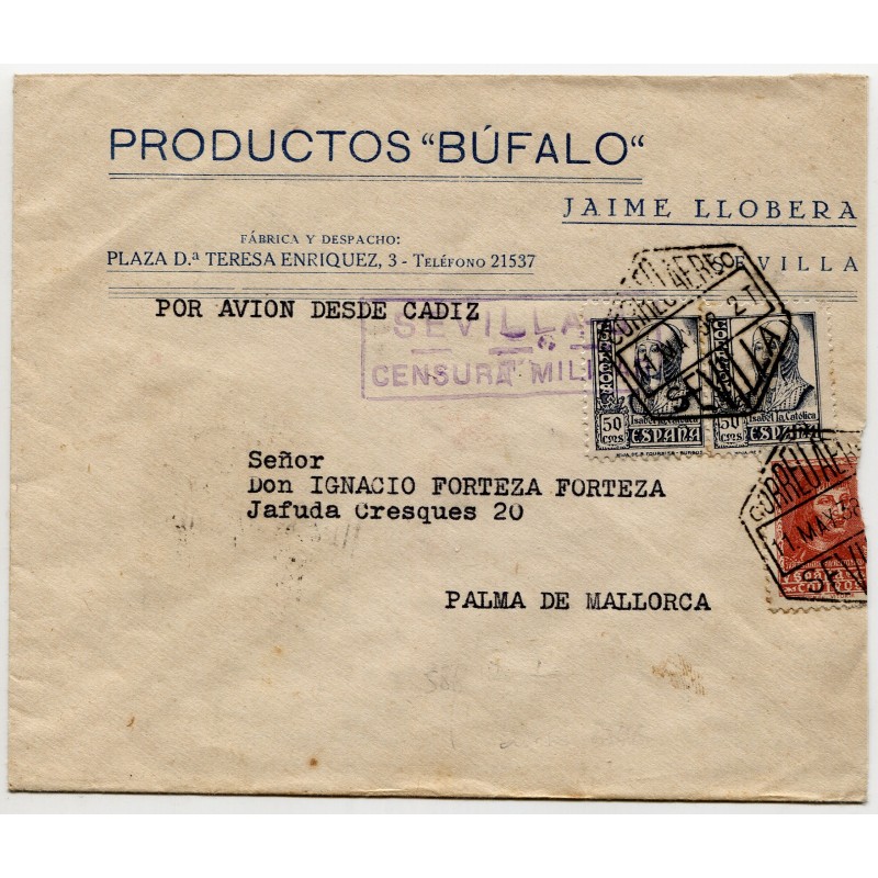 Sobre del correo aéreo de Sevilla a Palma de Mallorca con censura y local, 1938