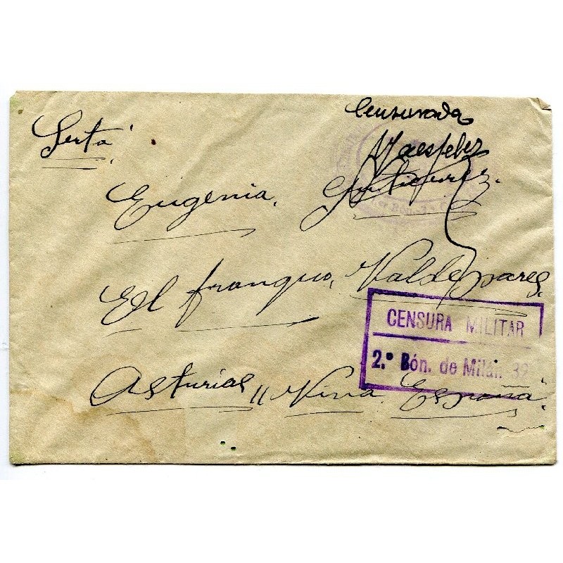 Sobre del frente a Valdepares, con marca del 2º Batallón de Milán 32 y marca de censura