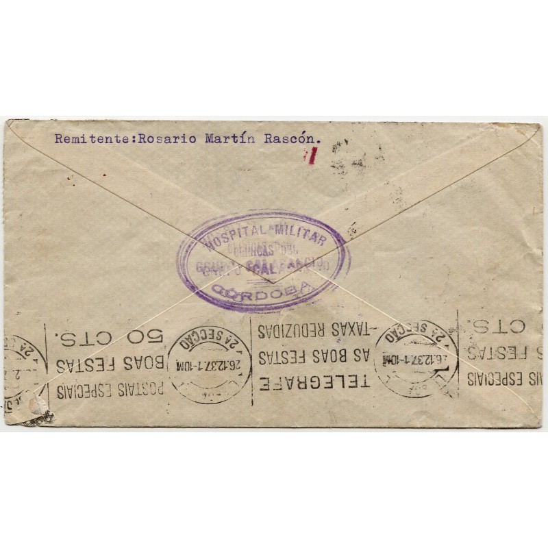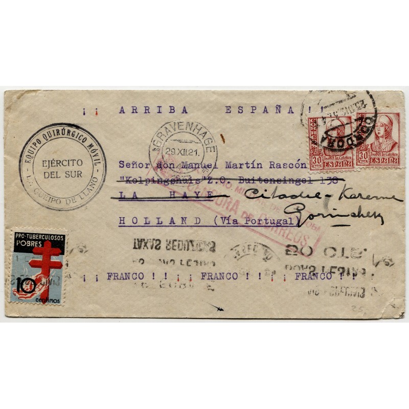 Marca "EQUIPO QUIRÚRGICO MÓVIL / EJÉRCITO DEL SUR / Dr. QUEIPO DE LLANO". Matasellos de Córdoba de 23 de diciembre de 1937 y censura Heller C122.3d. Tránsito de Gravenhage al frente y Lisboa al dorso. Marca "HOSPITAL MILITAR / GRUPO CALASANCIO / CÓRDOBA" al dorso.