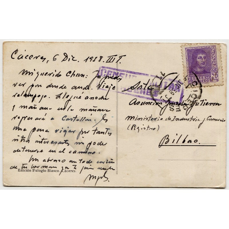 Tarjeta postal de Cáceres a Bilbao con marca de censura, 1938
