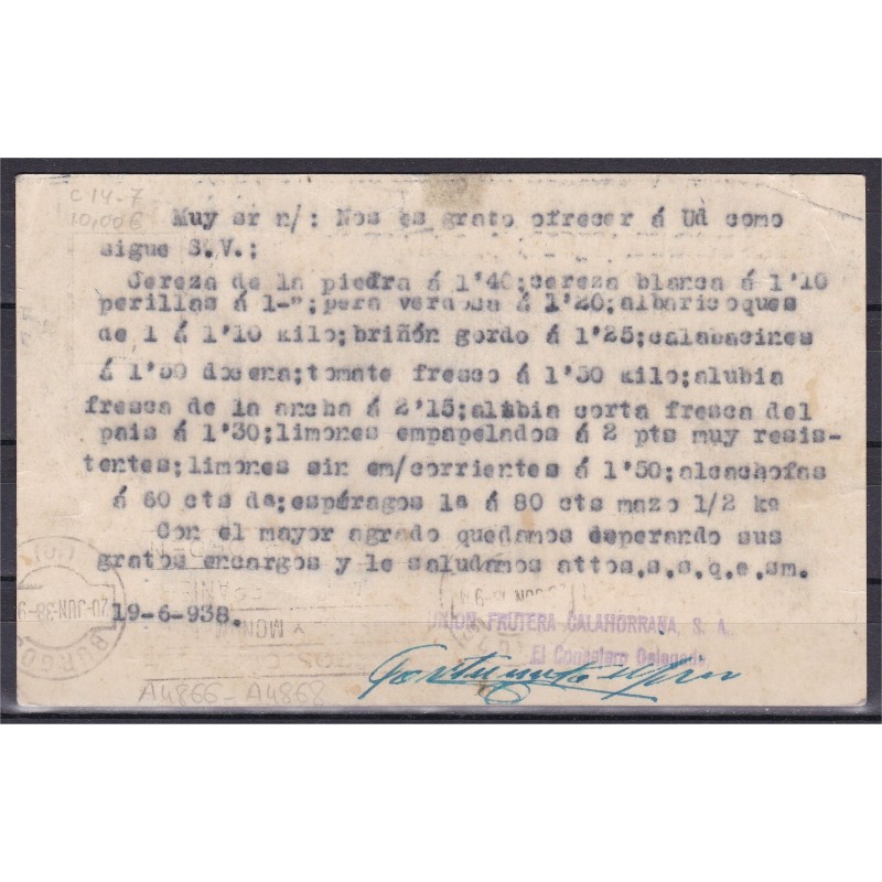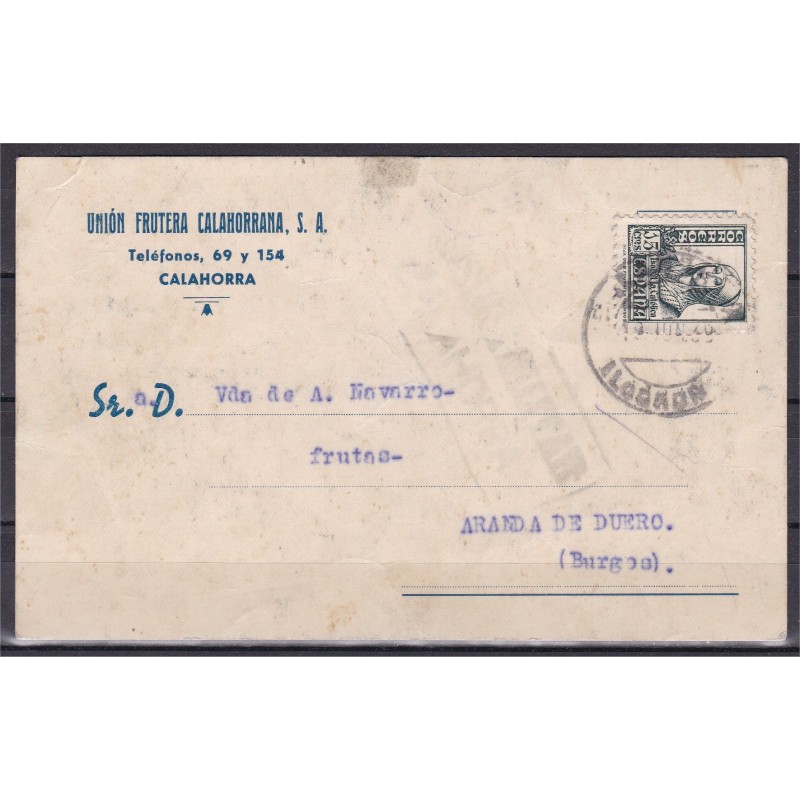 Tarjeta postal de Calahorra a Aranda de Duero con censura, 1938