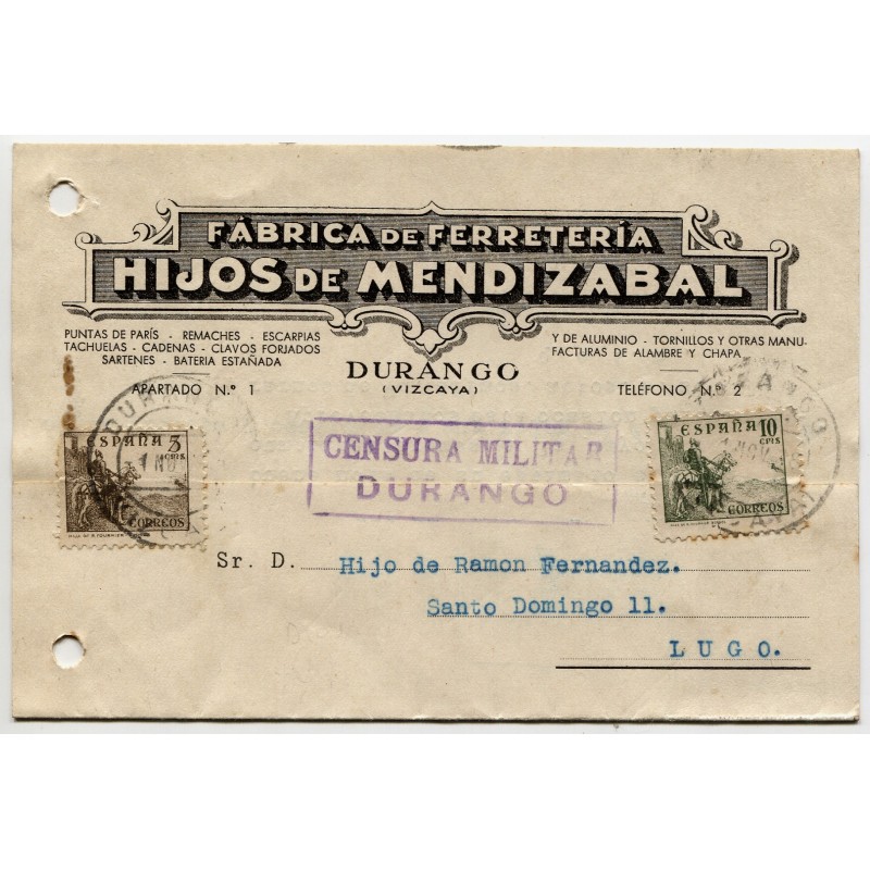 Tarjeta postal de Durango a Lugo con censura, 1938