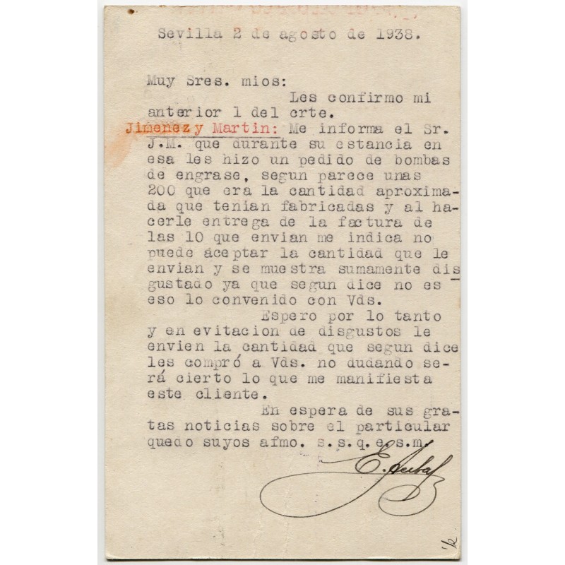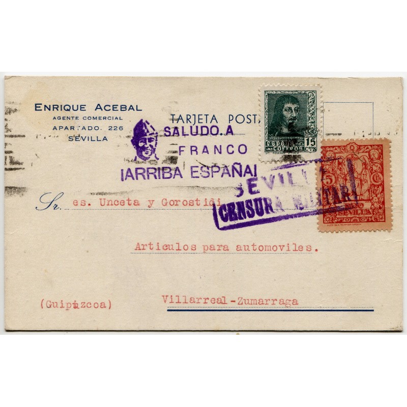 Tarjeta postal de Sevilla a Villarreal-Zumarraga, 1938