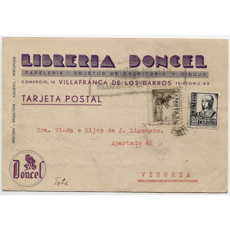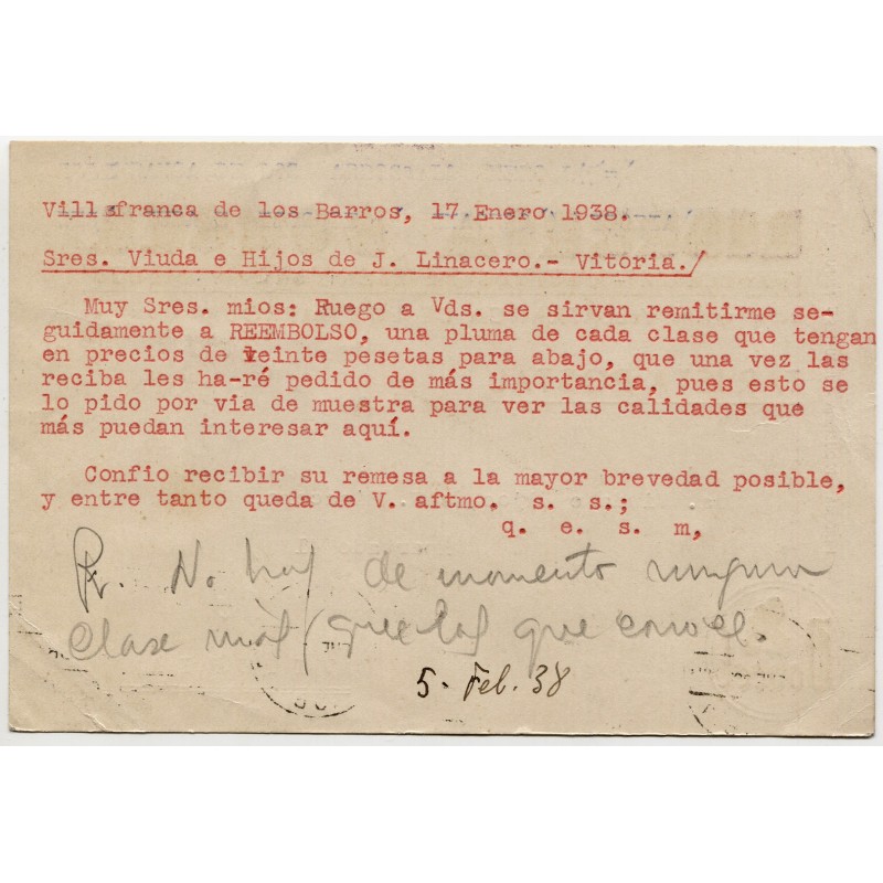 Tarjeta postal de Villafranca de los Barros a Vitoria con censura, 1938