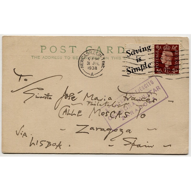 Tarjeta postal del Reino Unido a José María Francés, enlace postal del Requeté en Zaragoza, con marca de censura Heller Z8.4. Sello con bandeleta "Saving is Simple". Matasellos de Newcastle-on-Tyne de 31 de julio de 1938.