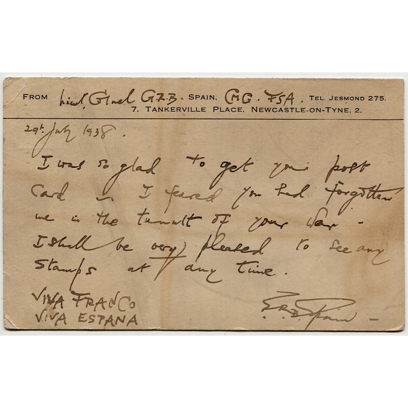Tarjeta postal del Reino Unido a José María Francés, enlace del Requeté en Zaragoza, 1938