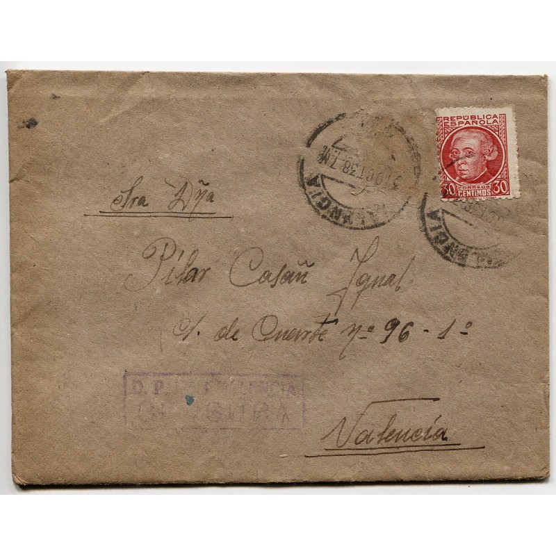Sobre de la prisión de San Miguel de los Reyes a Valencia, franqueado con 30c Edifil 687 y matasellos de Valencia de 31 Oct 1938. No falta ningún sello, puesto que el fechador está estampado sobre la sombra de lo que parece el espacio donde pudo haber otro sello. Marca de censura de San Miguel de los Reyes "D.P. Nº1 - VALENCIA / CENSURA".