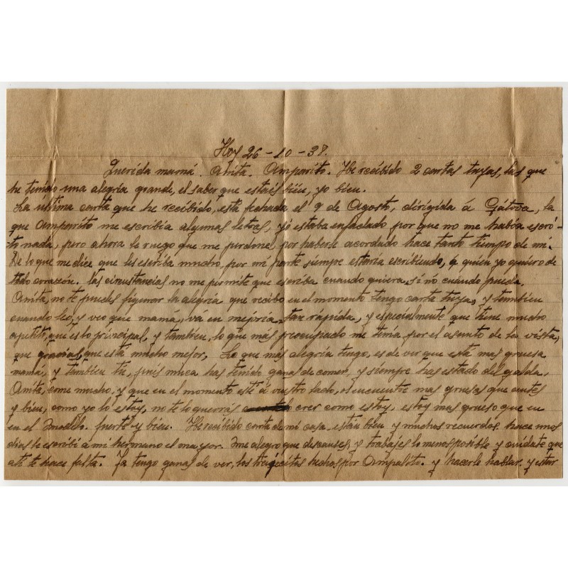 Sobre de la prisión de San Miguel de los Reyes a Valencia, franqueado con 30c Edifil 687 y matasellos de Valencia de 31 Oct 1938. No falta ningún sello, puesto que el fechador está estampado sobre la sombra de lo que parece el espacio donde pudo haber otro sello. Marca de censura de San Miguel de los Reyes "D.P. Nº1 - VALENCIA / CENSURA". Información del remite escrita en el interior de la solapa (6º Batallón de Fortificaciones, 1a Compañía). Con contenido.
