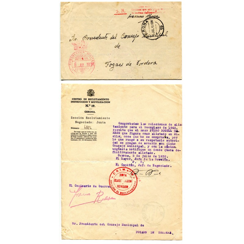 España, guerra civil, carta del CRIM 19 con marca de franquicia de la Comandancia Militar de Gerona, a Fogars de Tordera. La franquicia y el matasellos de Gerona están fechados el 6 de julio de 1938. Es un pliego, con la dirección escrita al dorso, sobre el alistamiento de un soldado. RRR.