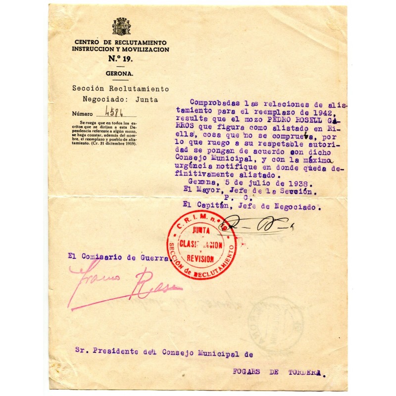 Description: España, guerra civil, carta del CRIM 19 con marca de franquicia de la Comandancia Militar de Gerona, a Fogars de Tordera. La franquicia y el matasellos de Gerona están fechados el 6 de julio de 1938. Es un pliego, con la dirección escrita al dorso, sobre el alistamiento de un soldado. RRR.