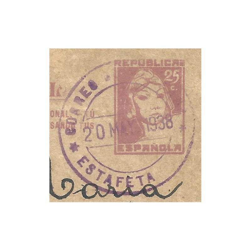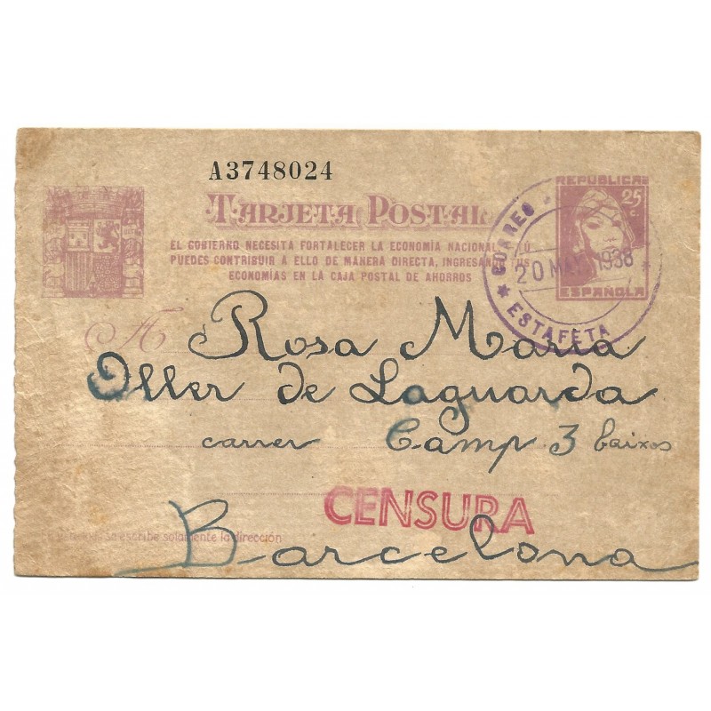 Entero postal Edifil 77 del frente a Barcelona, con matasellos “Correo de Campaña, Estafeta” fechado el 10 May 1938, y marca de censura militar.
