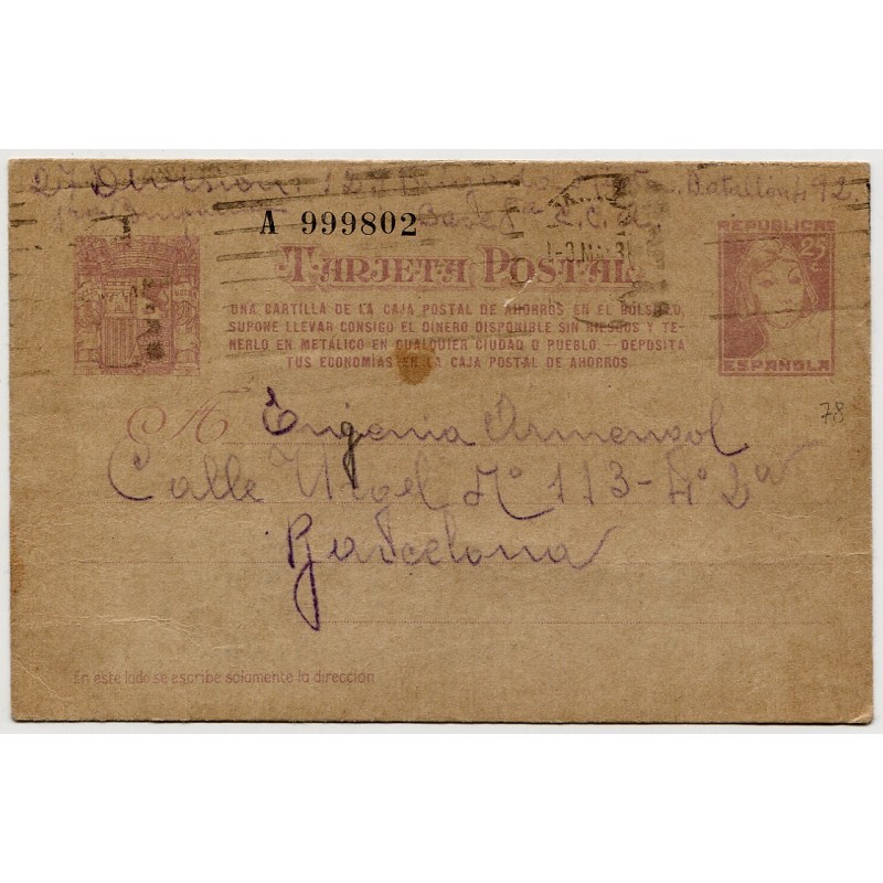 Entero postal Edifil 78 del frente a Barcelona, 1938.