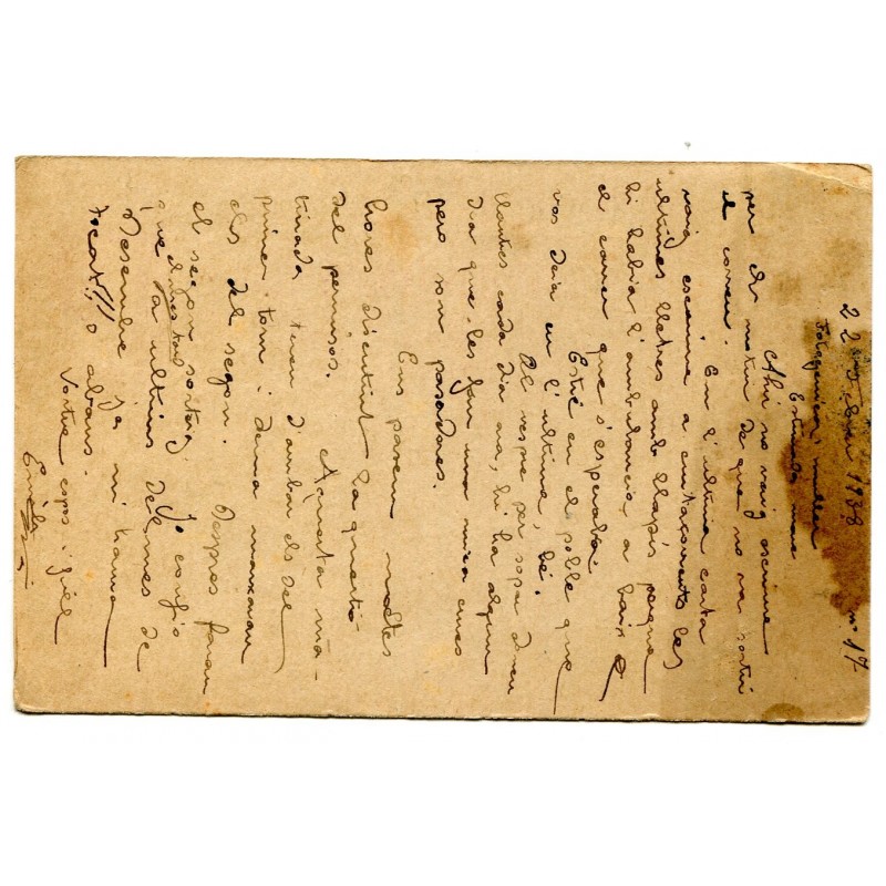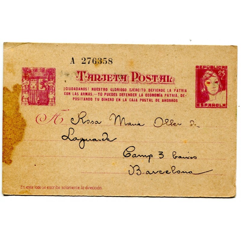 Entero postal Edifil 80 con número de serie de seis cifras, circulado a Barcelona pero sin matasellar. Texto fechado el 2 de febrero de 1938.