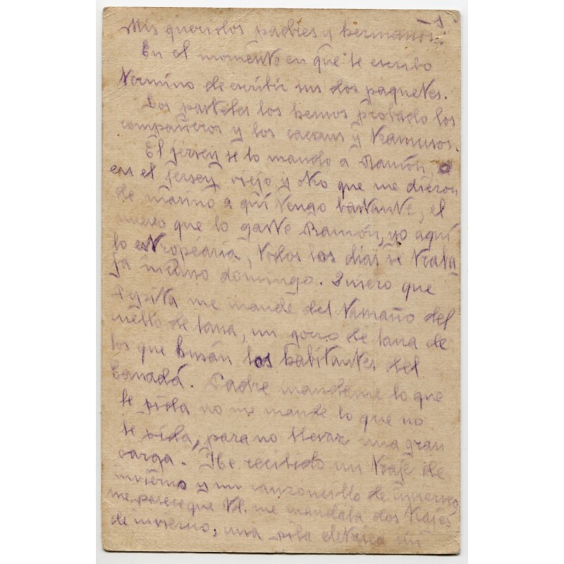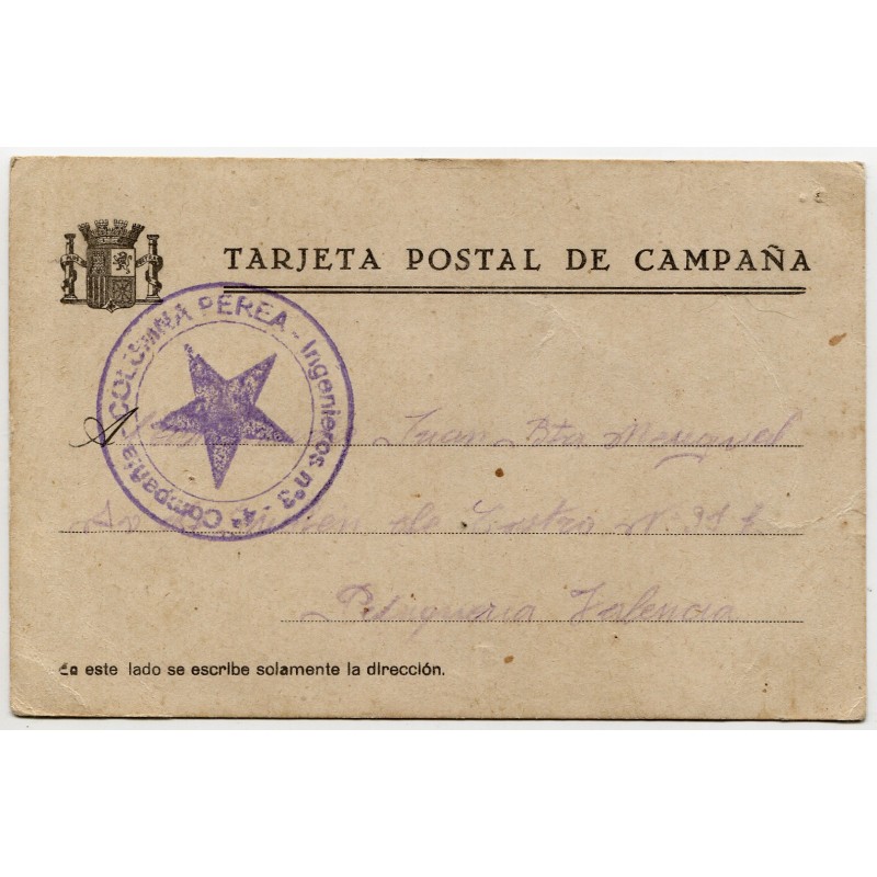 Marca "Columna Perea - Ingenieros nº 3 - 4a Compañía" en tarjeta postal de campaña a Valencia. Sin fecha. Allepuz 1669.