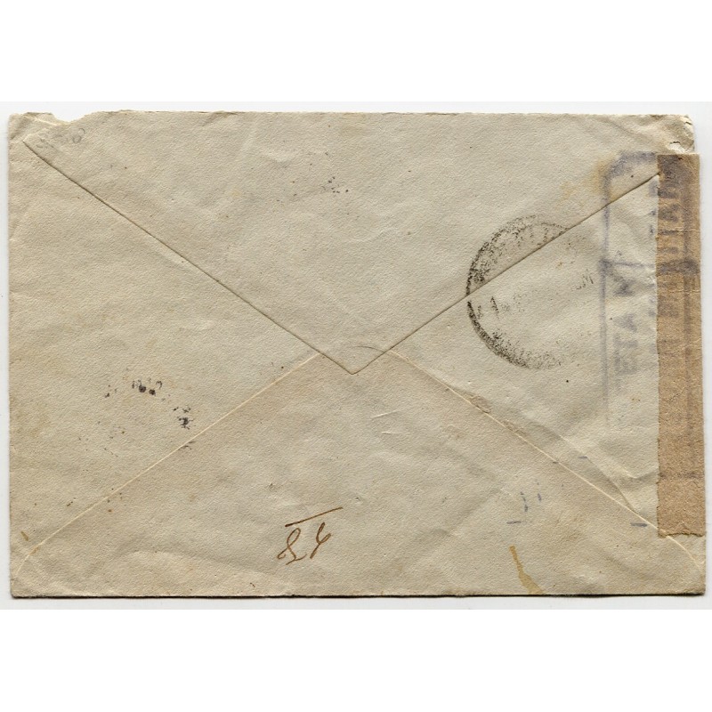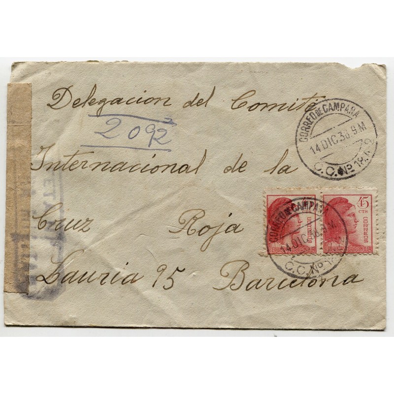 Sobre con matasellos del correo de campaña y censura a Barcelona