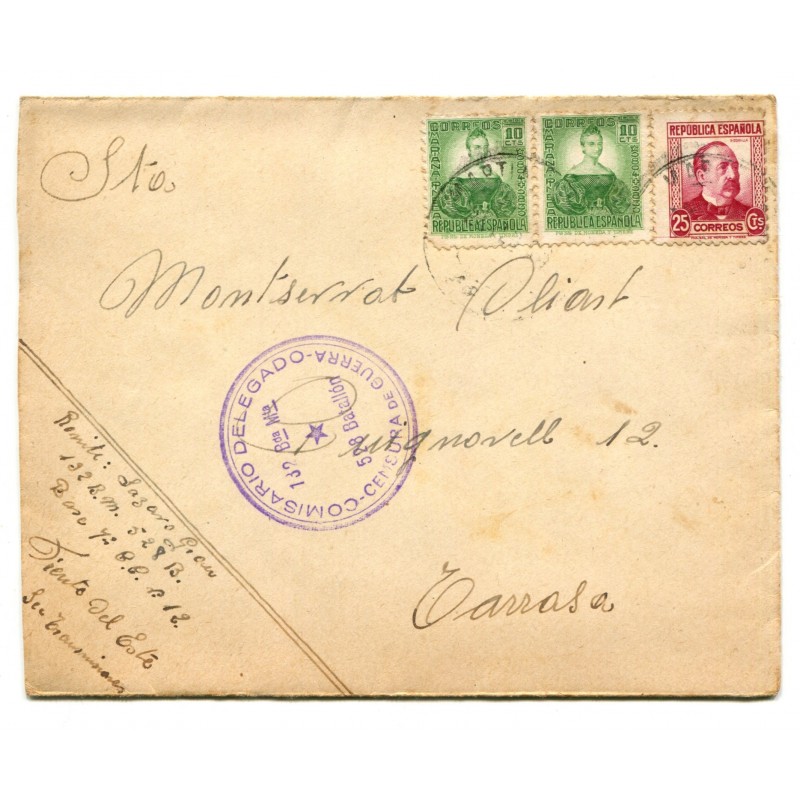 Sobre de Martín del Río a Terrassa, con marca de censura "Comisario delegado - Censura de Guerra / 132 Bda Mta / 528 Batallón"