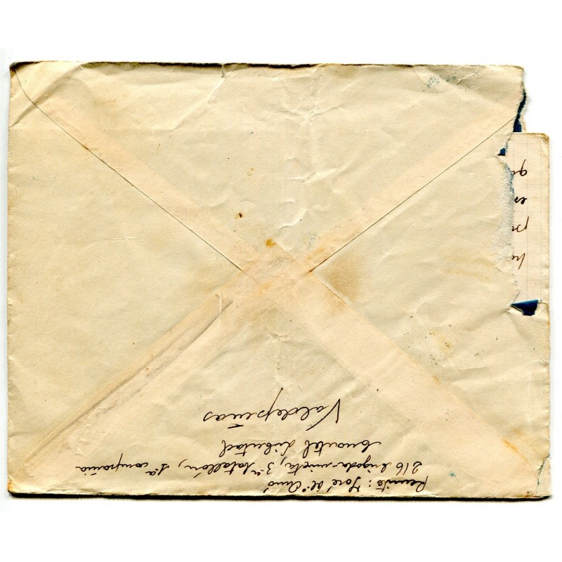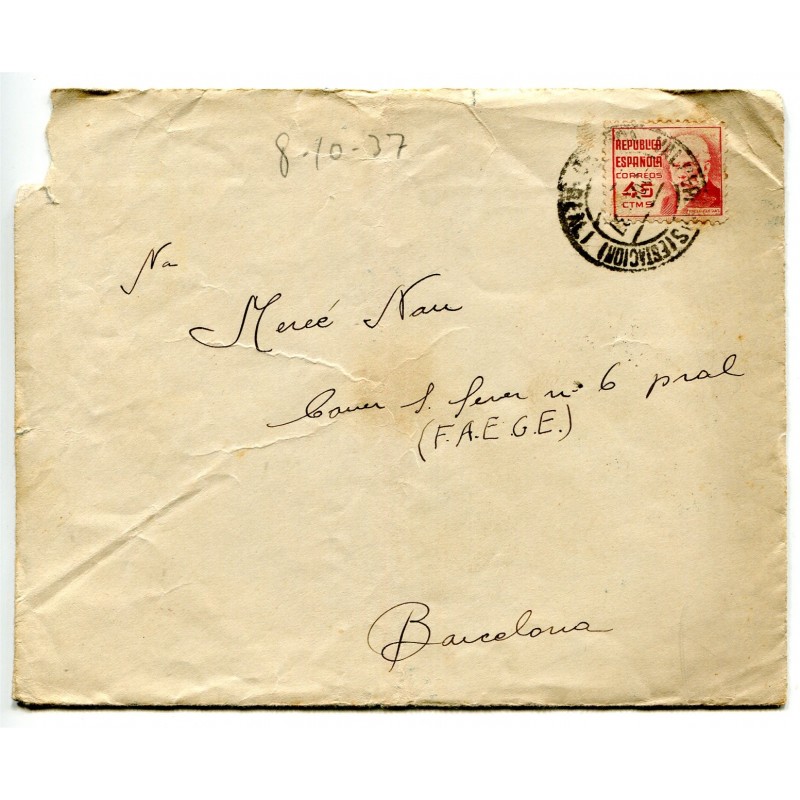 Sobre del Cuartel Libertad a Barcelona, franqueado con Edifil 737 y matasellos "Valdepeñas Estación", 1937. La información del remite al dorso dice "216 Brigada, 3er Batallón, 1a Compañía, Cuartel Libertad". Con contenido.