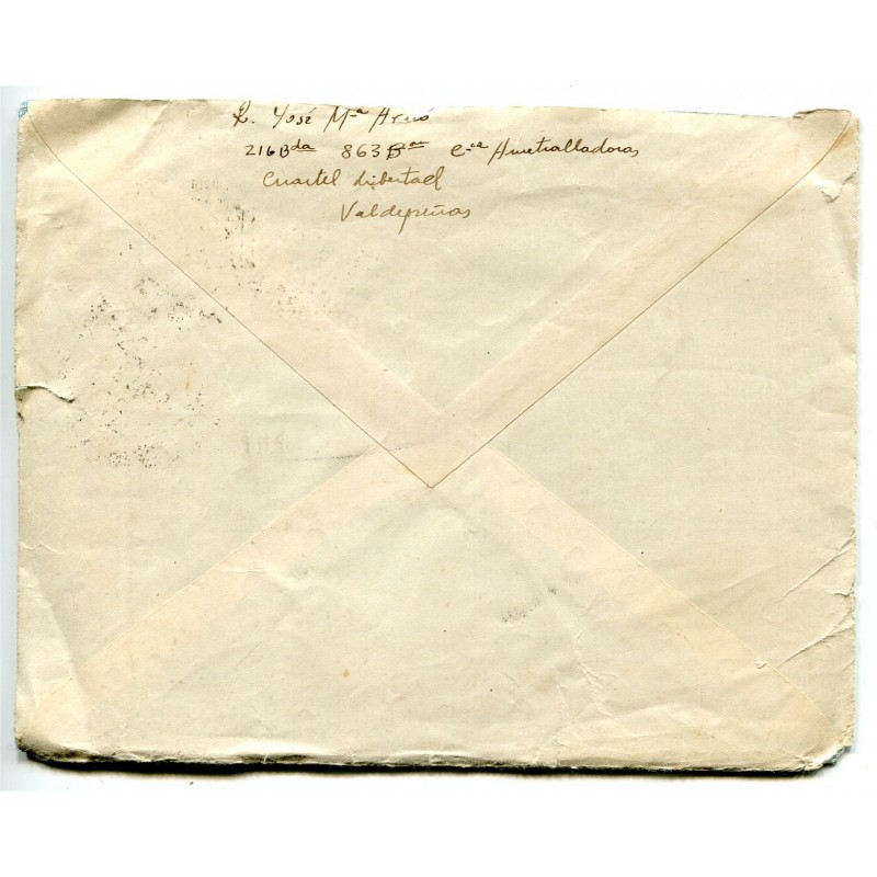 Sobre del Cuartel Libertad en Valdepeñas a Barcelona, 1937, franqueado con Edifil 737. La información del remite dice "216 Brigada, 863 Batallon, Compañía Ametralladoras, Cuartel Libertad". Con contenido.