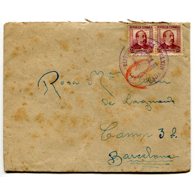 Sobre del frente a Barcelona, con pareja Edifil 685 y marca "República Española / Zapadores / 140 Brigada Mixta" usada como matasellos y censura a la vez, con "C" manuscrita en rojo por "Censura". Con contenido fechado el 2 de noviembre de 1938.