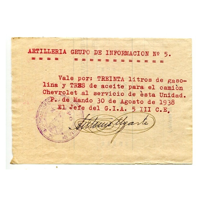 Ejército Republicano, vale con marca Grupo de Información de Artillería No 5, 1938