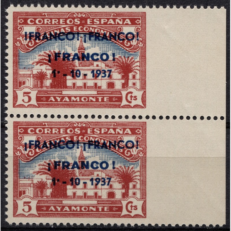 Variedad de composición en el sello superior, en el primer "!FRANCO!" con ambos signos de exclamación con el punto abajo en lugar del correcto "¡FRANCO!" (Allepuz 30a) y falta de dentado vertical en el margen derecho (variedad de dentado no catalogada).