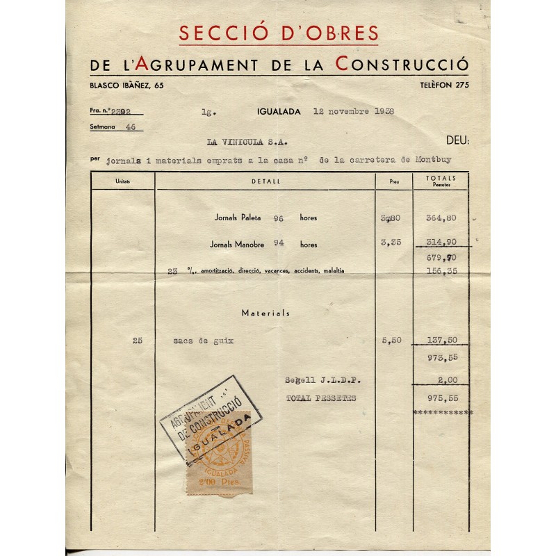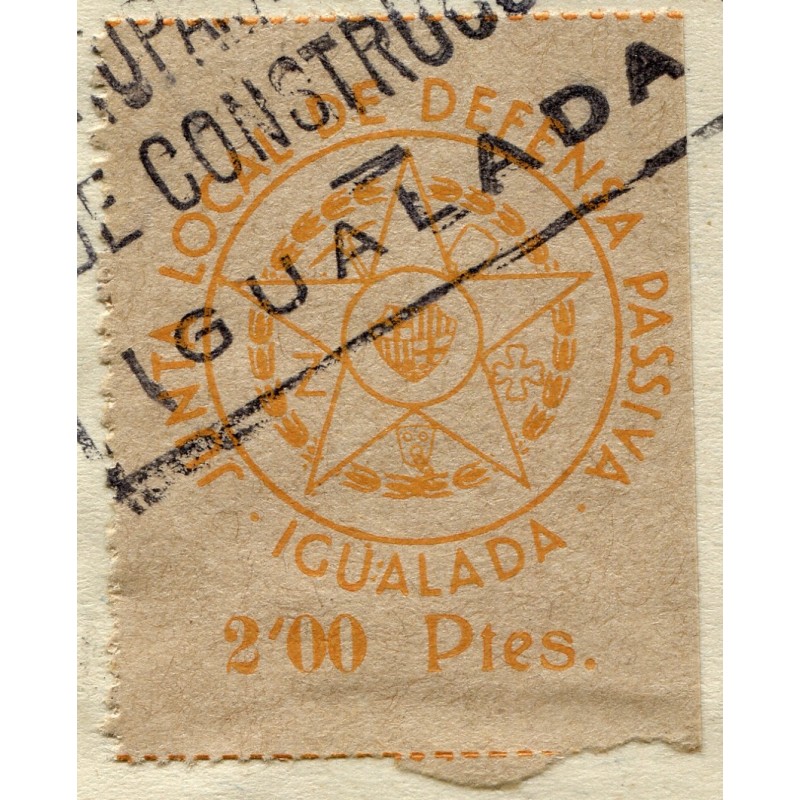 Usado sobre una factura de 12 de noviembre de 1938. El importe del sello está incluído en la factura. Usado como tasa para financiar la construcción de sistemas de defensa. Cancelado con marca "AGRUPACIÓ / DE CONSTRUCCIÓ / IGUALADA"
